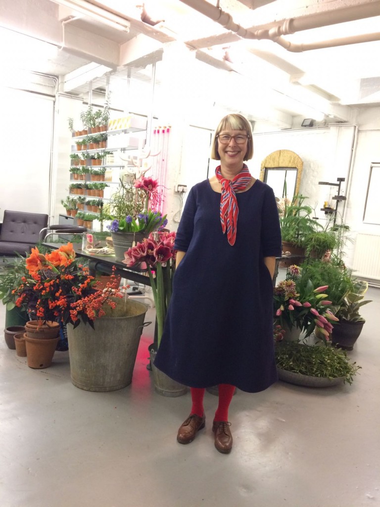Here is The Lovely Sue Parker Projects in her pop up corner shop at 4th Floor London wearing her blue wool/cotton kiso dress. This is basically the ‘shift’ with added sleeves