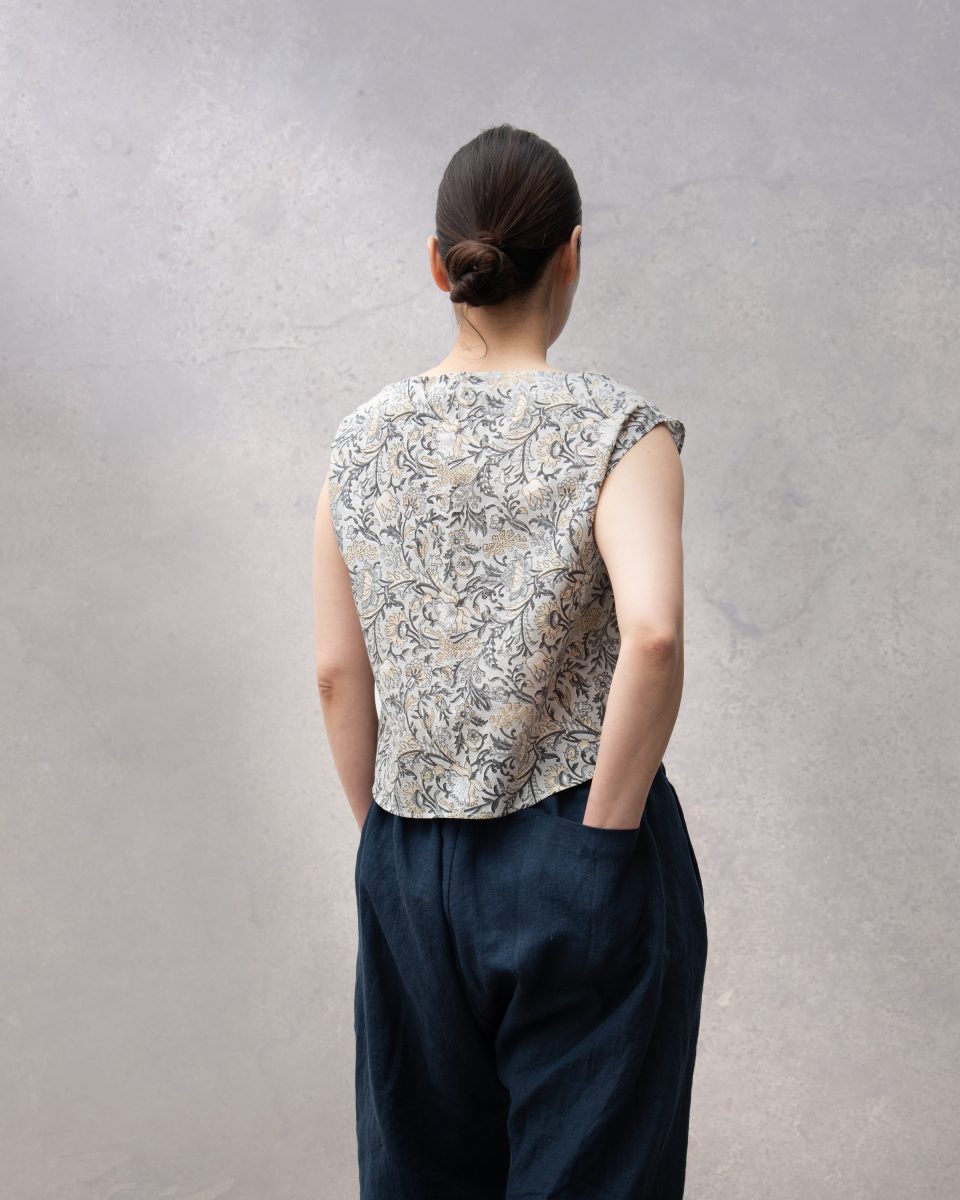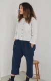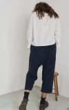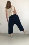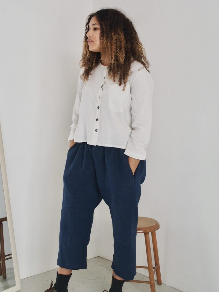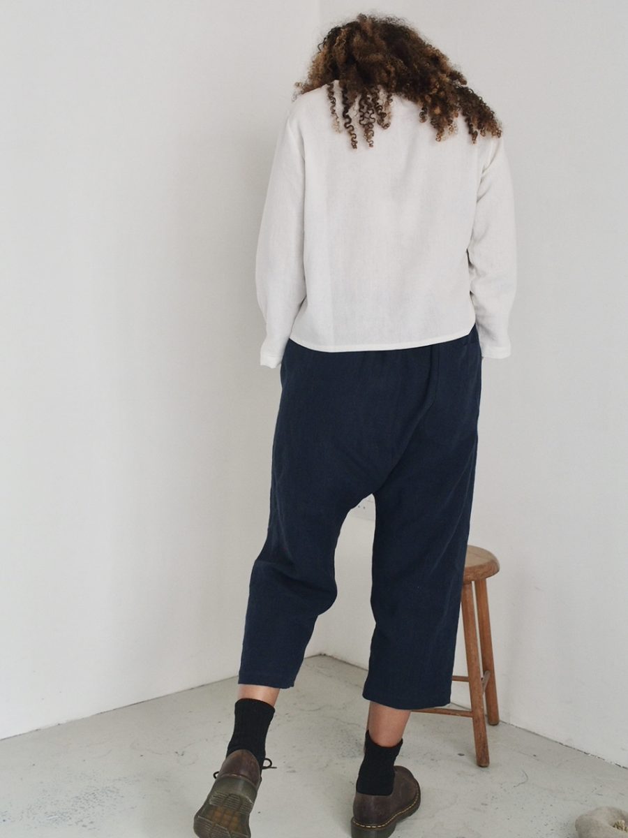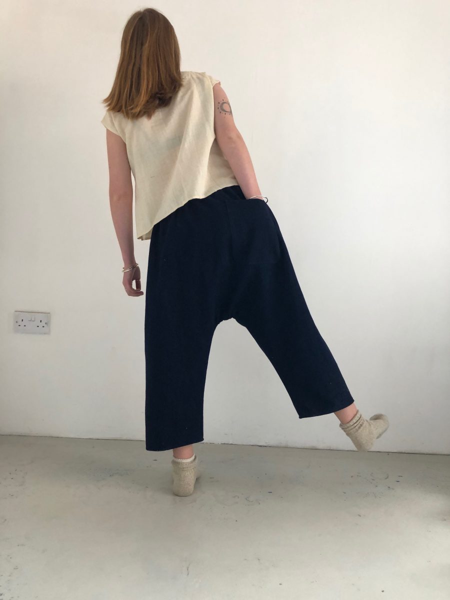 One piece (no seam at the front or sides) easy fitting trousers with a dropped  crutch and elasticated waist with two deep pockets set slightly forward and a patch pocket back right.