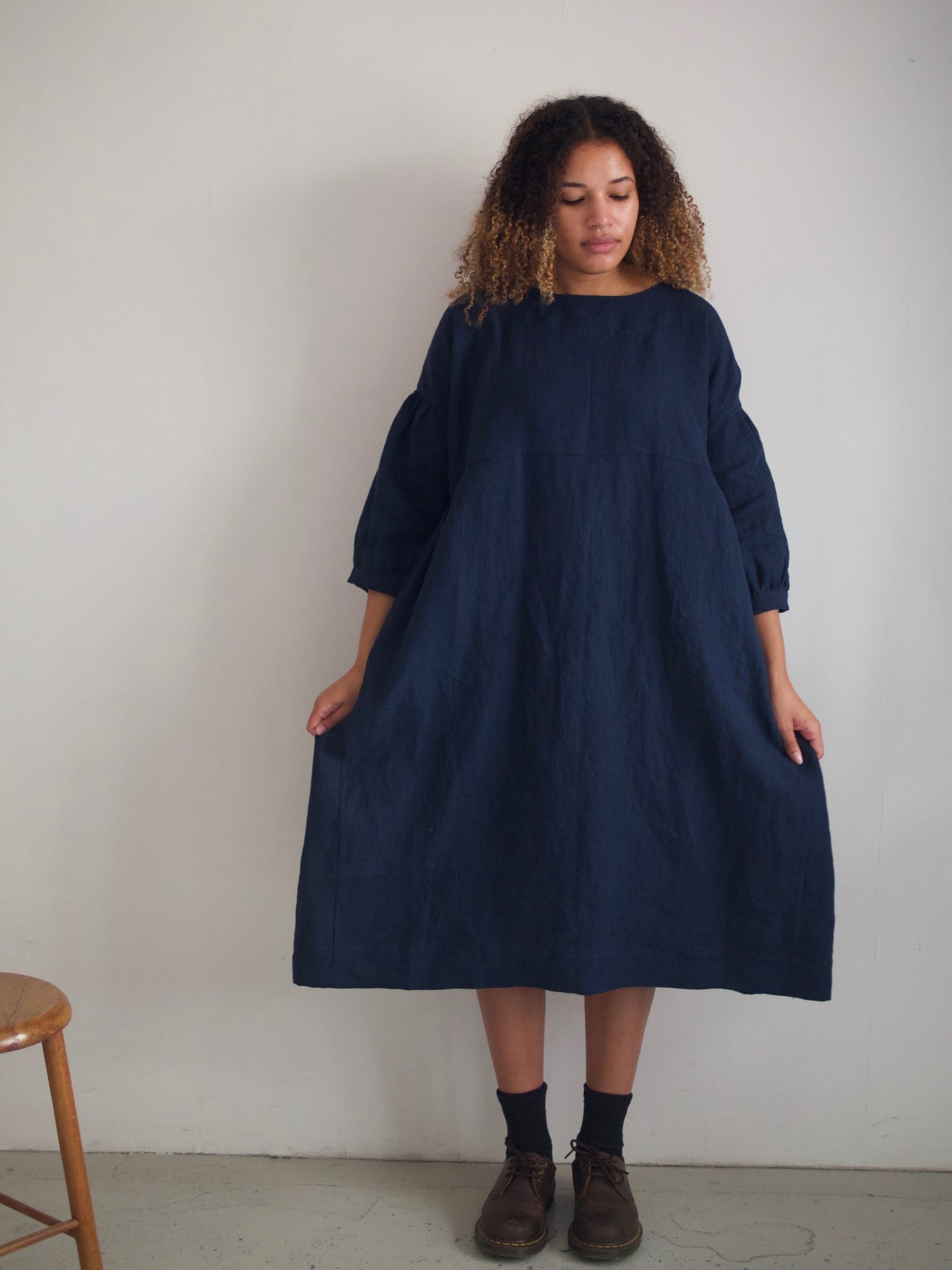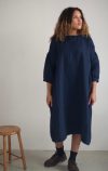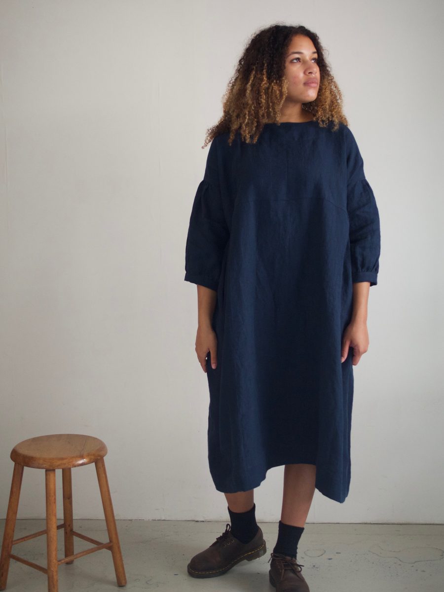 Loose dress with 3/4 gathered high waist, dropped balloon sleeves which end above the wrist and two deep pockets set into the side seams and french seams throughout.