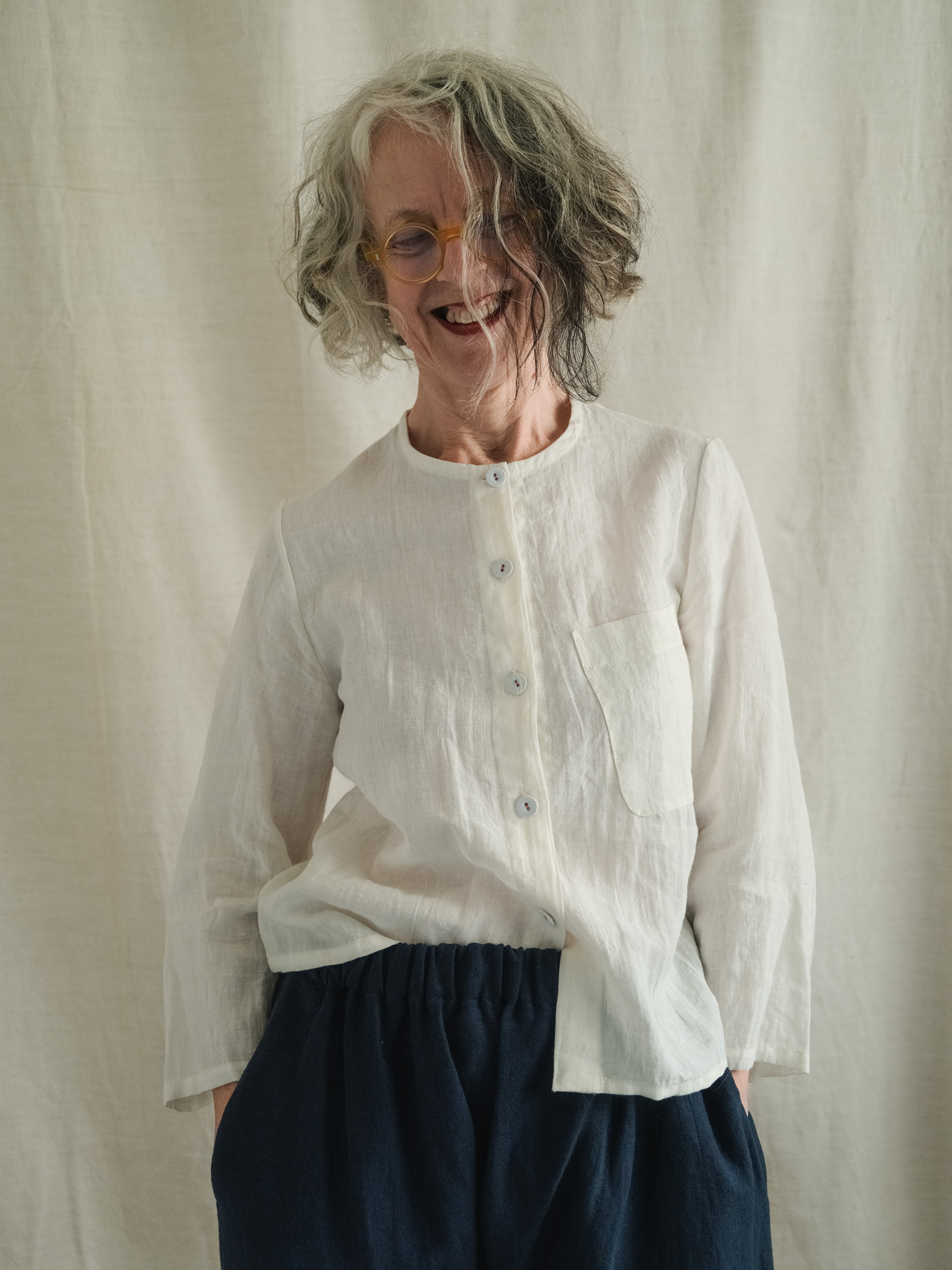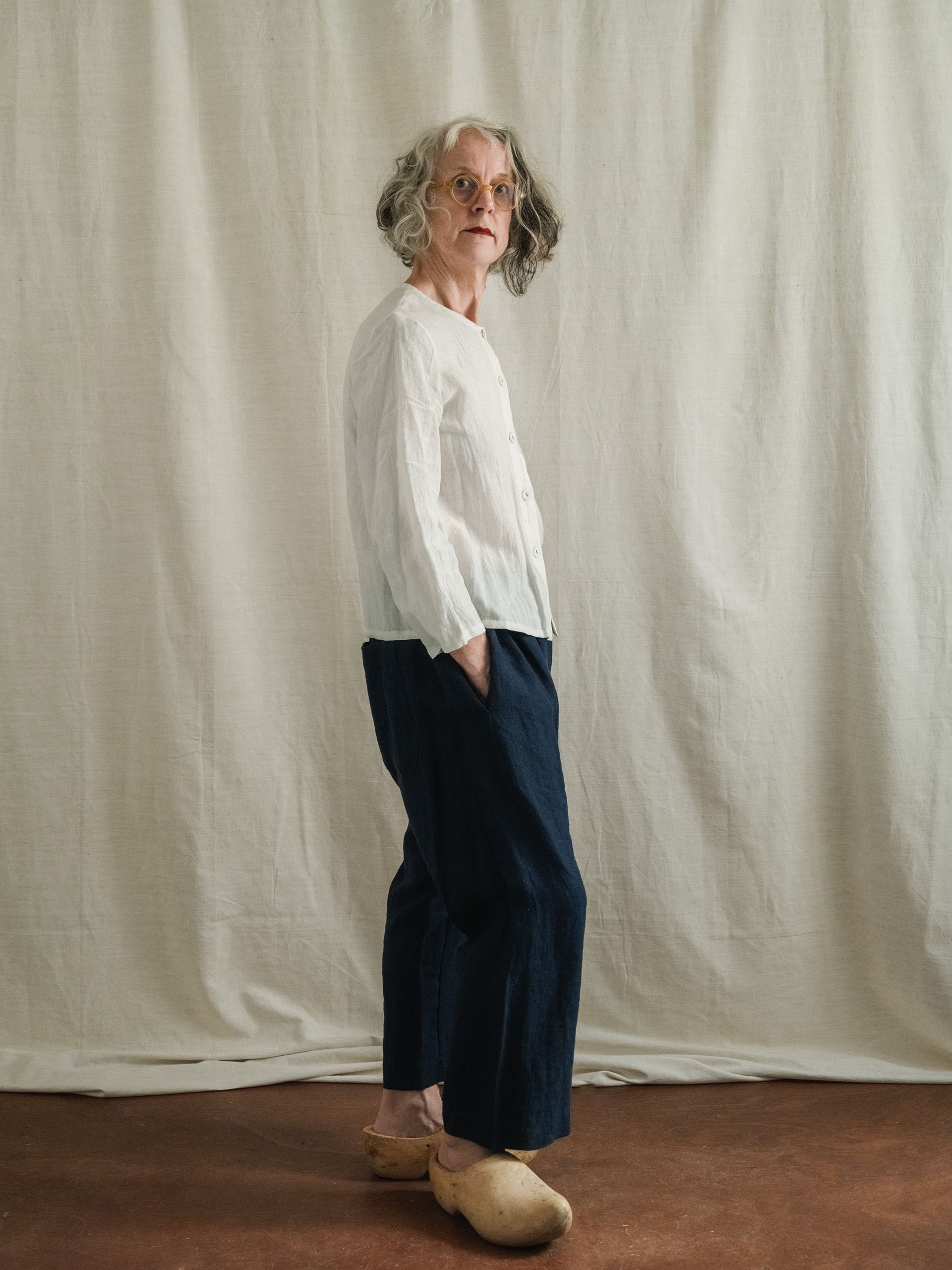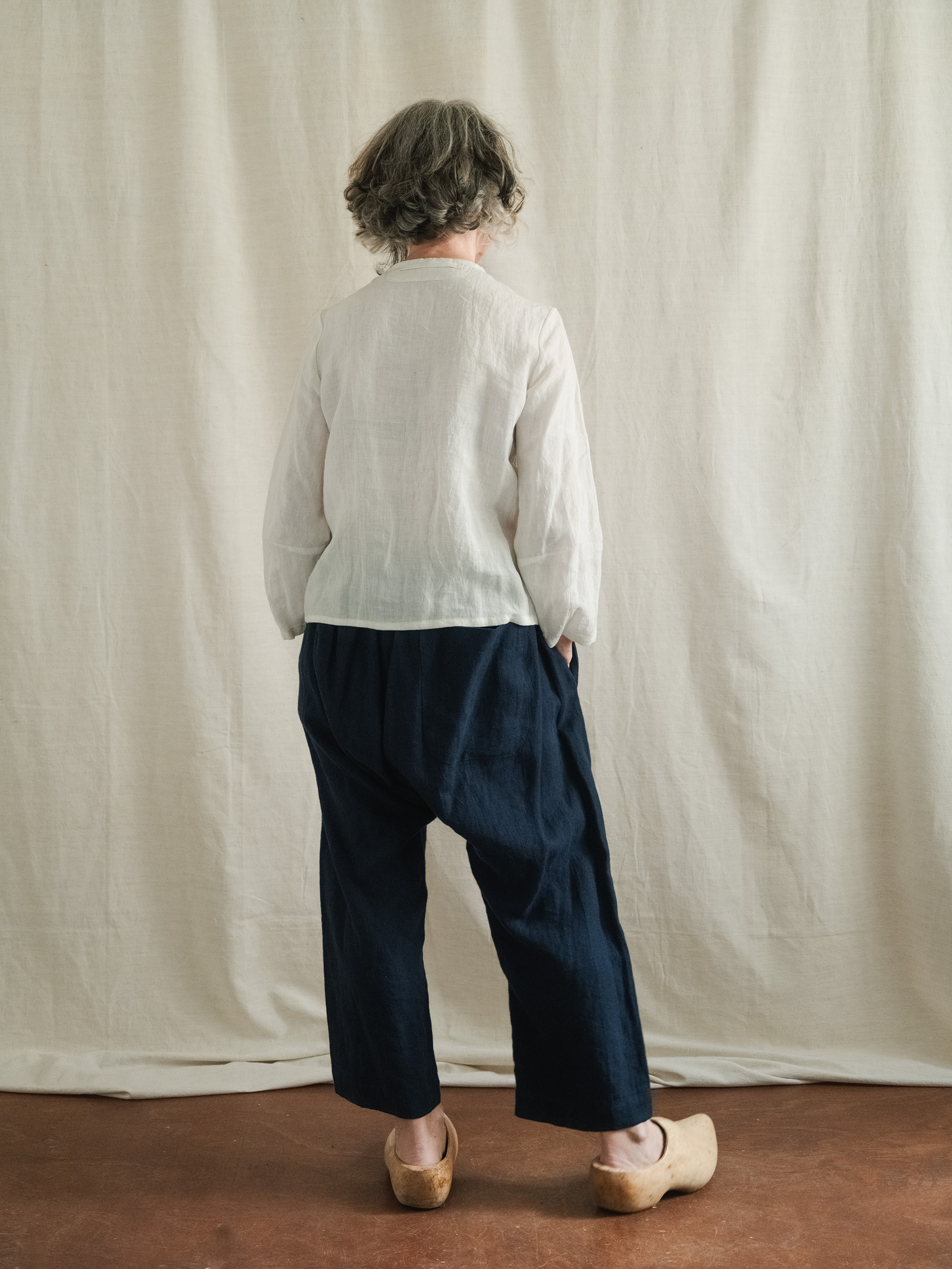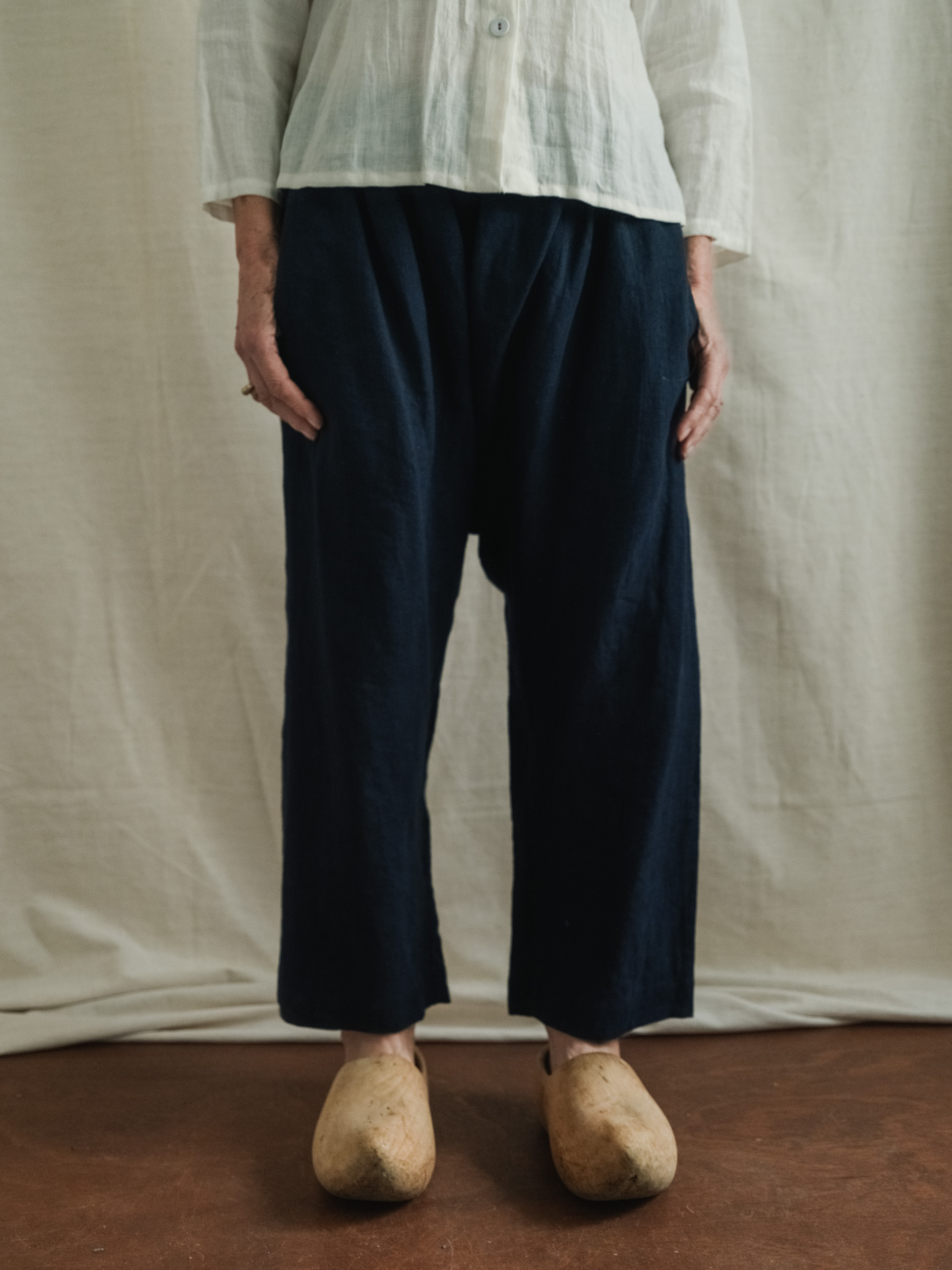 One piece (no seam at the front or sides) easy fitting trousers with a dropped  crutch and elasticated waist with two deep pockets set slightly forward and a patch pocket back right.